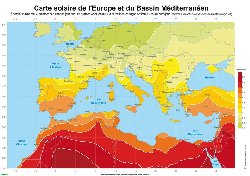 Potentiel production solaire Europe, France, Bretagne, Saint-Malo
